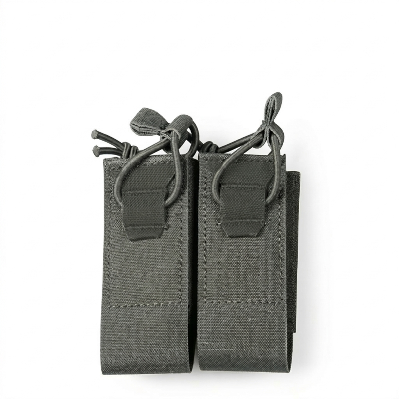 DPMP pistol MOLLE pouch is designed as a compact double pouch for common double-stack pistol magazines such as Glock, CZ, SIG as well as single-stack 1911. The 500D nylon construction combines a low weight of about 55 g with high resistance to wear. Magazines are secured inside the pouch by a combination of elastic side material and an adjustable bungee cord, so they stay firmly in place during movement but can still be drawn smoothly and without resistance. Thanks to the MOLLE webbing, it can be easily attached to a plate carrier, belt or backpack. The pouch is also suitable for a small flashlight or a multitool.