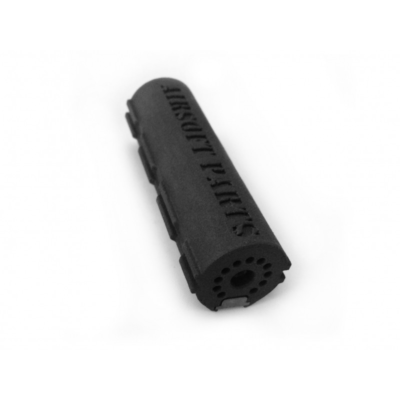 The piston contain of a very durable plastic body and a full metal teeth (14 pcs). The second tooth is remove to decrease the chance of pre-engagement by the sector gear. The front site of the piston has a light weight design, which makes a total weight only 14.95g. By reducing the weight, the piston's movement speed increases during the shot, thus increasing FPS and reducing the dynamic stress of the gearbox.