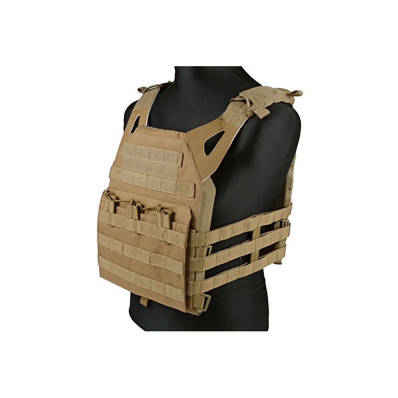 A very light and functional plate carrier type vest, made from durable nylon. It is made from two panels – front and back, which are connected with light skeletal cummerbund, which are made only from stiffened straps. These straps can also hold additional accessories and pouches.