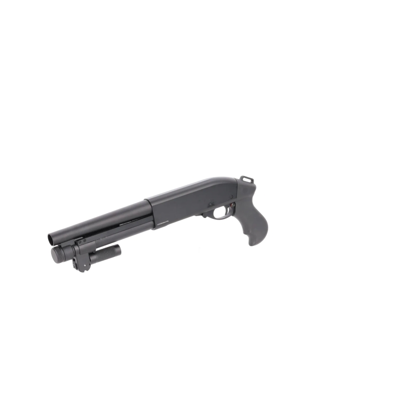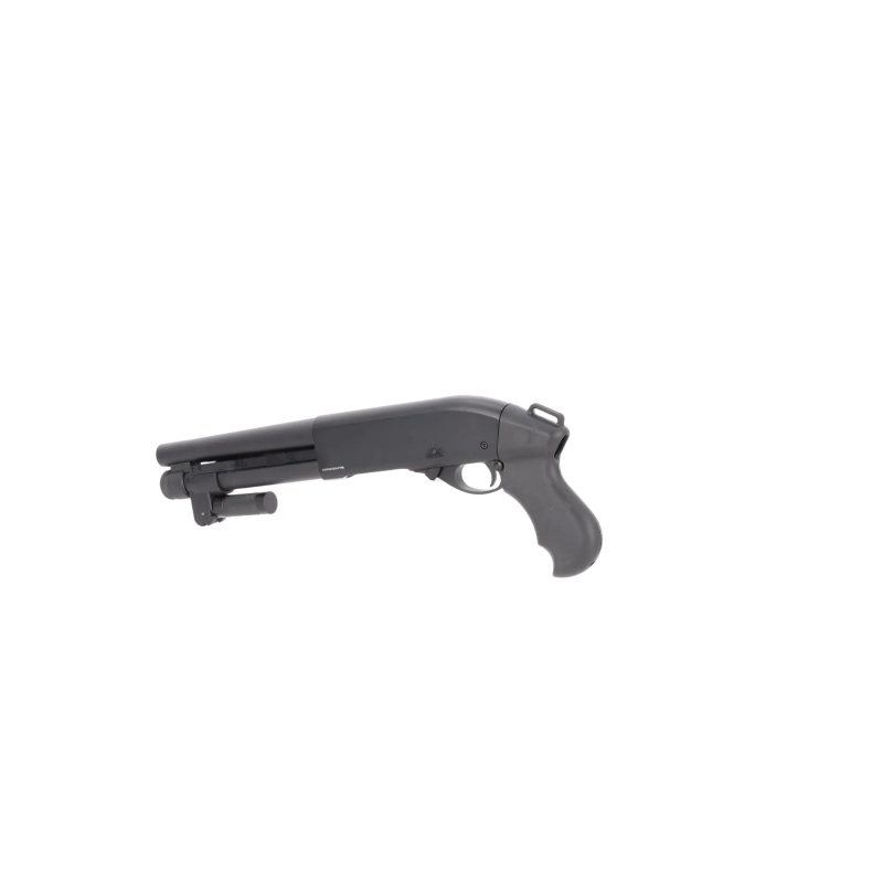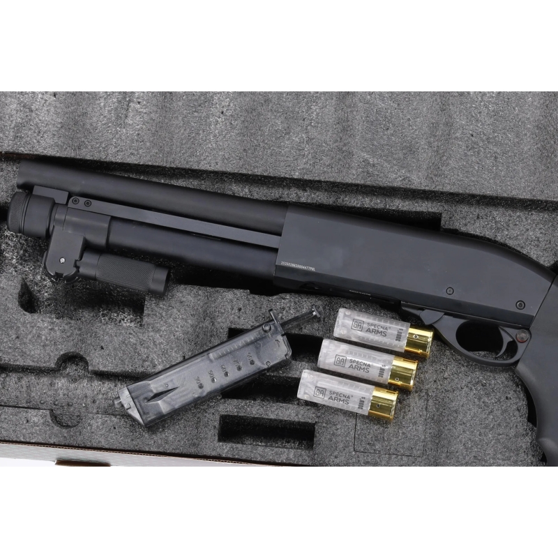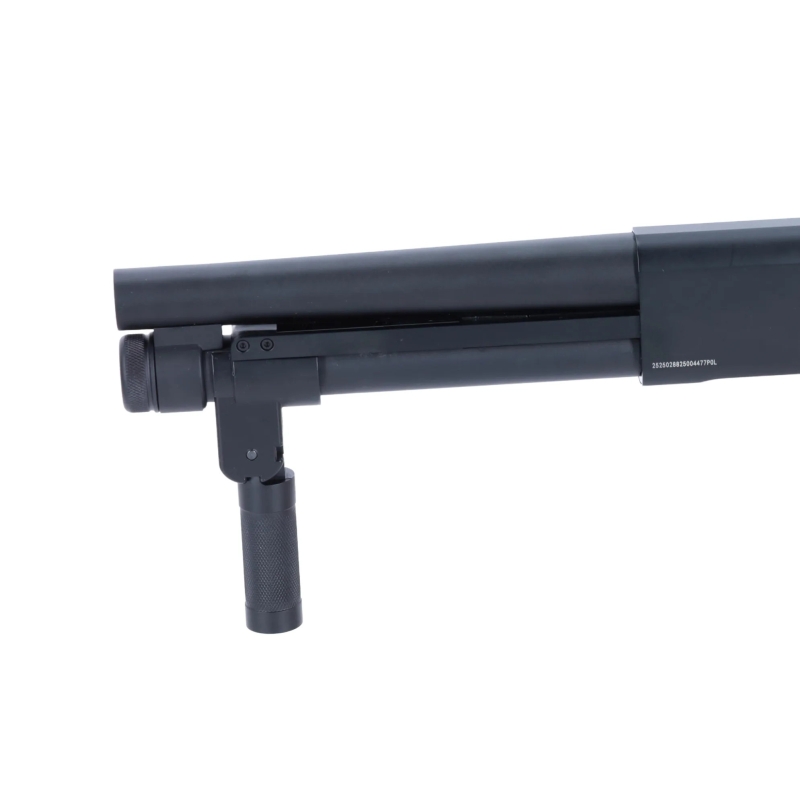 Looking for a compact and lightweight pump-action shotgun for CQB games? Want to use realistic 30 BB shells? Need a reliable gas-powered system with the option to shoot 3 or 6 BBs per trigger pull? Then the Specna Arms SA-VGS11 VAPOR™ is made for you. Designed as a versatile CQB shotgun, it combines metal construction with durable polymer parts. Powered by Green Gas (the gas reservoir is integrated into the gun), it provides consistent power and reliable operation. It features a reinforced nozzle for stable gas delivery and a selector switch under the shell port allowing 3 or 6 BBs per shot. Safety is ensured by a manual safety and a shell port lock button. The VAPOR™ series is designed for fast handling in CQB environments, easy reloading, and excellent performance. The SA-VGS11 model offers a classic handguard with a folding foregrip for fast and firm pumping. This version does not include a stock, making it ideal as a secondary or breacher shotgun for close combat use.