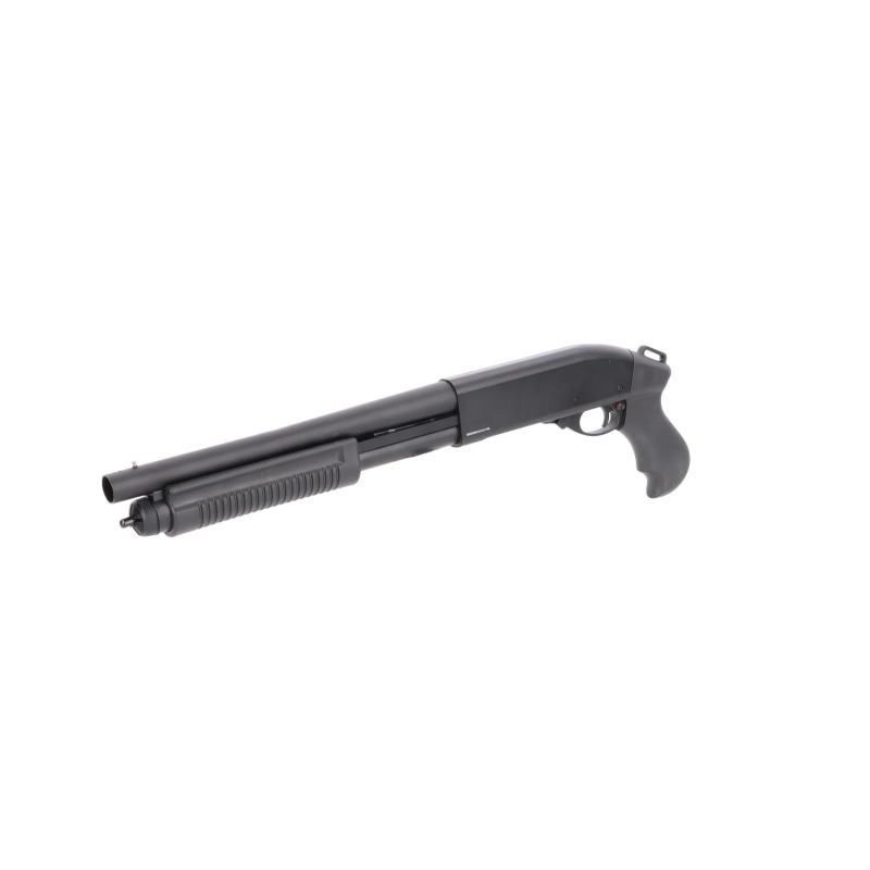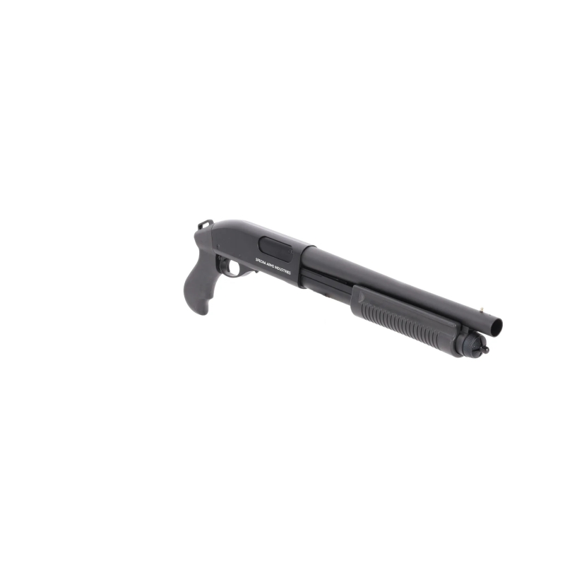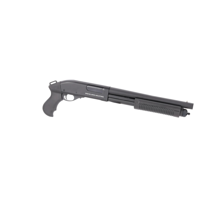Looking for a compact and lightweight pump-action shotgun for CQB? Want to use realistic 30 BB shells? Need a reliable gas-powered system with the option to fire 3 or 6 BBs per shot? Then the Specna Arms SA-VGS17 VAPOR™ is the perfect choice. Designed as a versatile CQB shotgun, it combines metal construction with durable polymer components. Powered by Green Gas (with an integrated gas reservoir inside the weapon), it delivers stable power and excellent reliability. A reinforced nozzle ensures consistent gas flow, and the firing mode selector under the shell port lets you choose between 3 or 6 BBs per shot. Safety features include a manual safety and a shell port release button. The VAPOR™ series is designed for quick handling in CQB scenarios, smooth reloading, and reliable field performance. The SA-VGS17 model features a classic ergonomic foregrip for easy pumping. With no stock, it can be comfortably used as a compact backup shotgun.