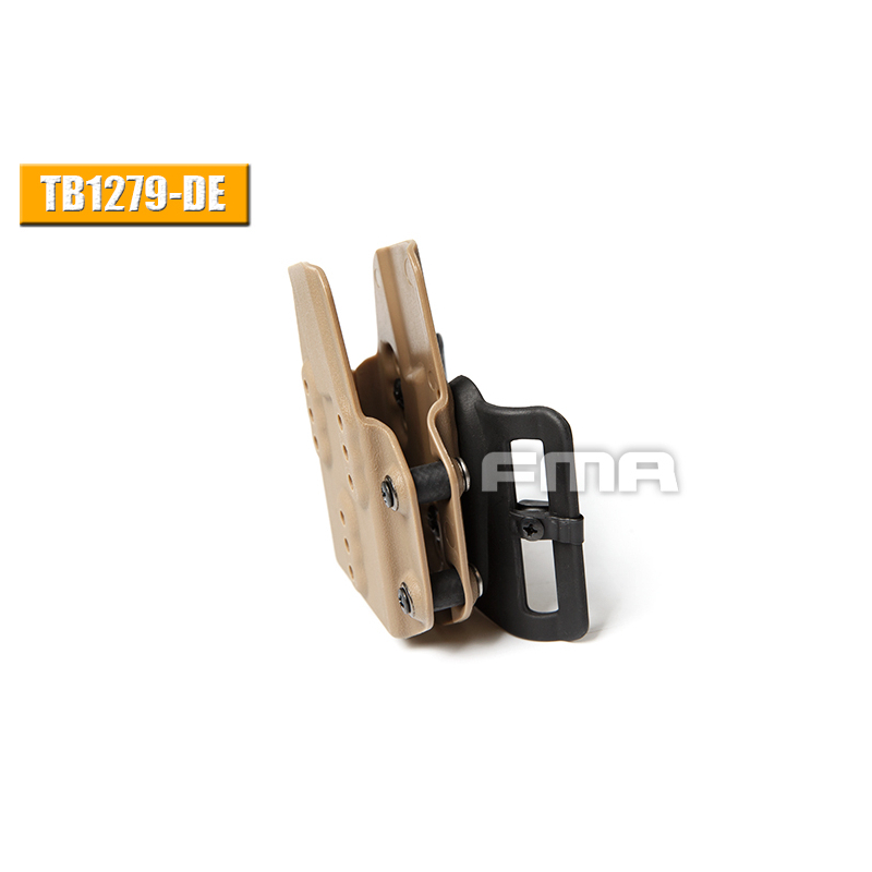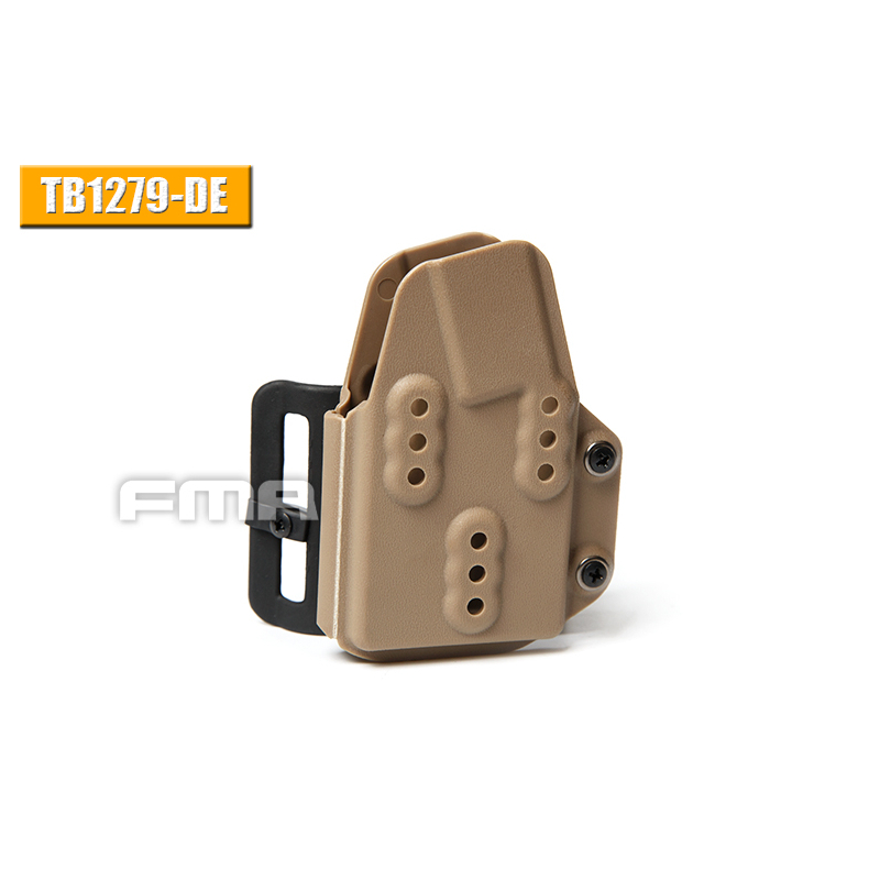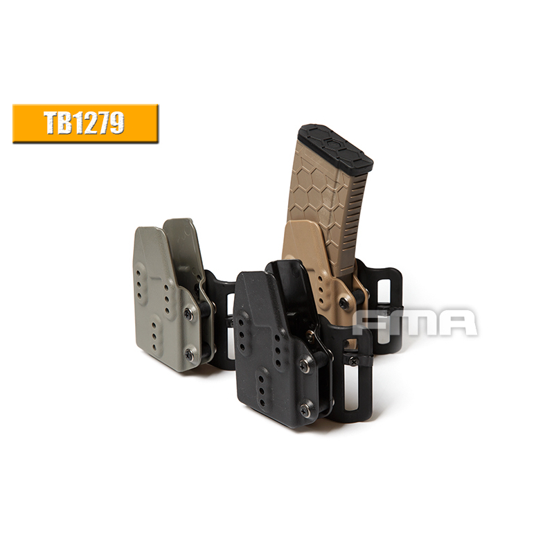 This Kydex magazine pouch by FMA is designed for rifle magazines for the AR15 (M4/16) and other firearms with a 5.56/.203 Remington caliber. The magazine is held in place solely by plastic retention, allowing for quick extraction and insertion without the need for additional securing. The retention can be adjusted with a screw to fit specific magazine widths, ensuring flexibility for different brands and models like STANAG or P-MAG (or airsoft magazines such as S-Mag, DMAG, EPM, and others).