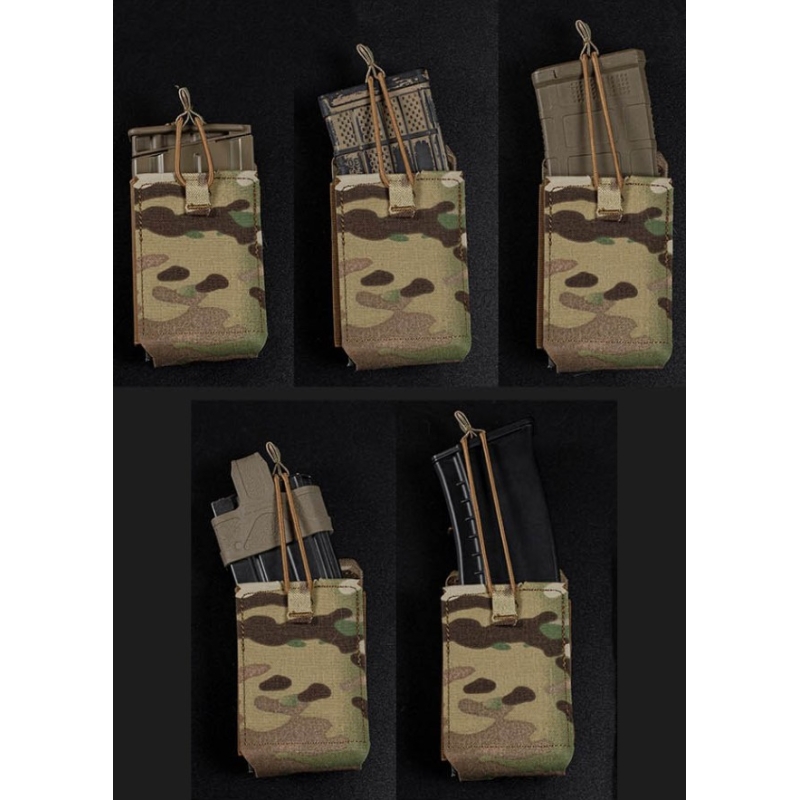 The SRMP model is designed for quick access to rifle magazines without a flap. The open-top design allows instant draw, while the internal plastic insert ensures firm retention even without the use of a bungee cord. Elastic side panels adapt to different magazine types, from standard M4 (5.56) through AK (7.62) to wider SR25 or MK17 (SCAR-H). The rear side features a laser-cut MOLLE system for secure attachment to a vest, plate carrier or tactical belt. Durable CORDURA nylon construction ensures long service life even under heavy use.