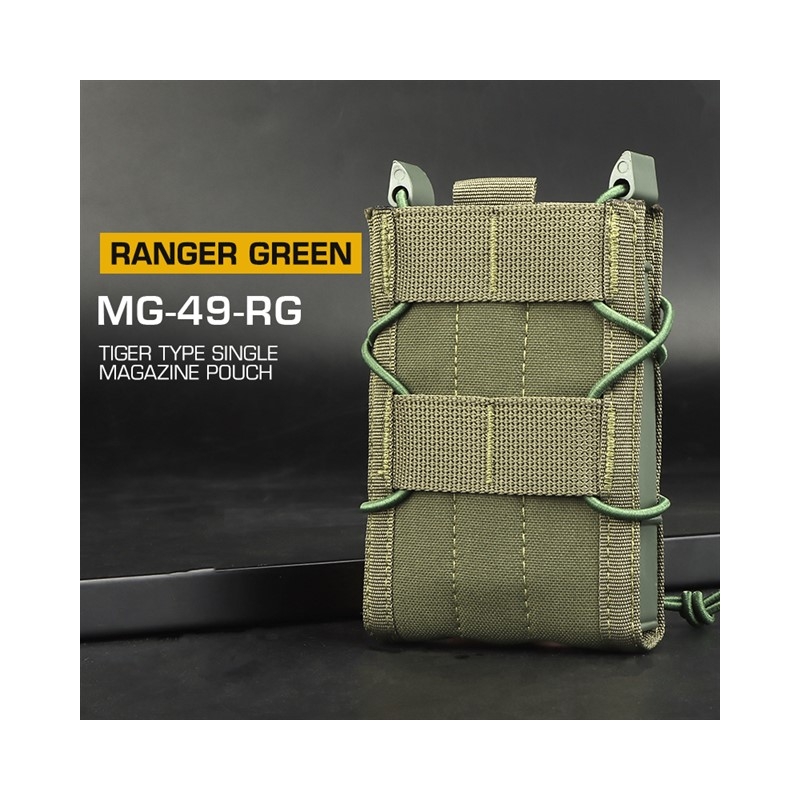 The Tiger type MOLLE pouch by WoSport is designed for M4/16 (AR15 / 5.56) magazines. The pouch has a very good magazine grip thanks to the adjustable elastic cord with stopper. It also features side plastic braces to maintain its shape for easy insertion of the magazine into the empty pouch.