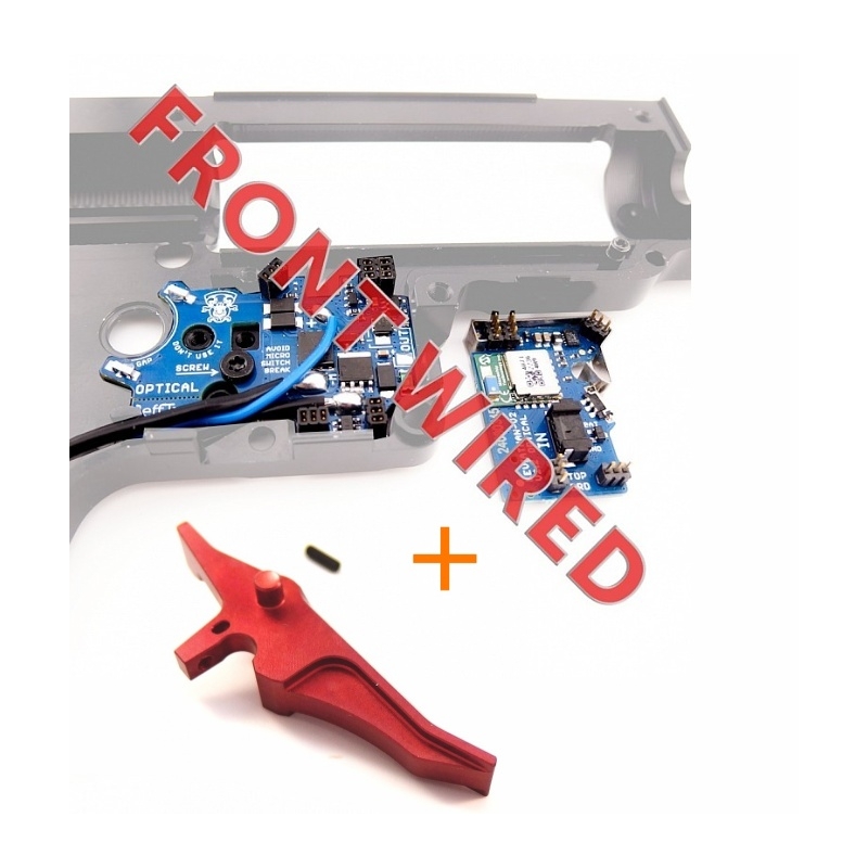 Leviathan V2 Optical is an electronic ETU unit with Bluetooth, designed to be installed in gearbox V2 and V2.5 based on the TM standard. Thanks to its optical sensors for shot detection and fire selector position, and an ultra-short switch (just 0.13 mm), it enables a precise hair trigger mode. The Real Feel Trigger System (RFTS) simulates realistic trigger resistance using a spring and provides trigger reset after each shot. You can configure firing modes, rate of fire, active braking, pre-cocking, virtual magazine, and more in real time using the JeffTron app. The input and output ports allow connection of accessories such as flashlights, electric magazines, or an empty magazine sensor. The unit is coated with conformal lacquer. It supports high-RoF setups including DSG gearsets and is ready for Brushless motors like Warhead. All changes made in the app are saved instantly to the unit’s memory. Additionally, the unit comes with a CNC aluminum trigger from Retro Arms featuring an adjustable screw for pre-travel and stylish design.
