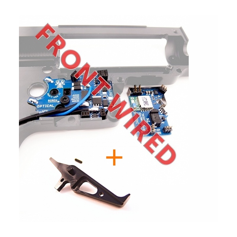 Leviathan V2 Optical is an electronic ETU unit with Bluetooth, designed to be installed in gearbox V2 and V2.5 based on the TM standard. Thanks to its optical sensors for shot detection and fire selector position, and an ultra-short switch (just 0.13 mm), it enables a precise hair trigger mode. The Real Feel Trigger System (RFTS) simulates realistic trigger resistance using a spring and provides trigger reset after each shot. You can configure firing modes, rate of fire, active braking, pre-cocking, virtual magazine, and more in real time using the JeffTron app. The input and output ports allow connection of accessories such as flashlights, electric magazines, or an empty magazine sensor. The unit is coated with conformal lacquer. It supports high-RoF setups including DSG gearsets and is ready for Brushless motors like Warhead. All changes made in the app are saved instantly to the unit’s memory. Additionally, the unit comes with a CNC aluminum trigger from Retro Arms featuring an adjustable screw for pre-travel and stylish design.