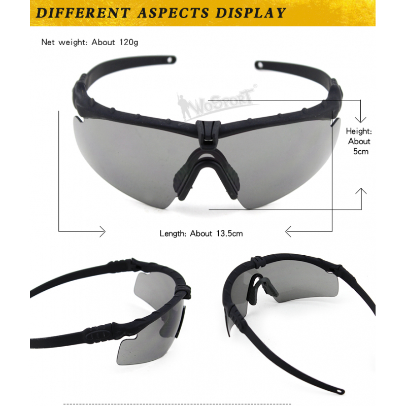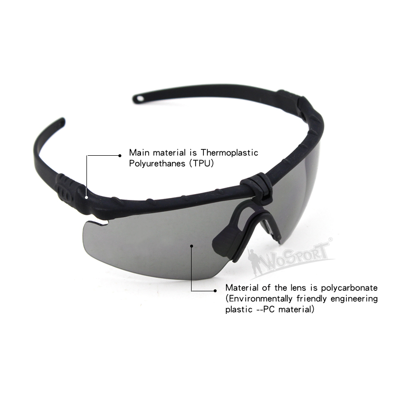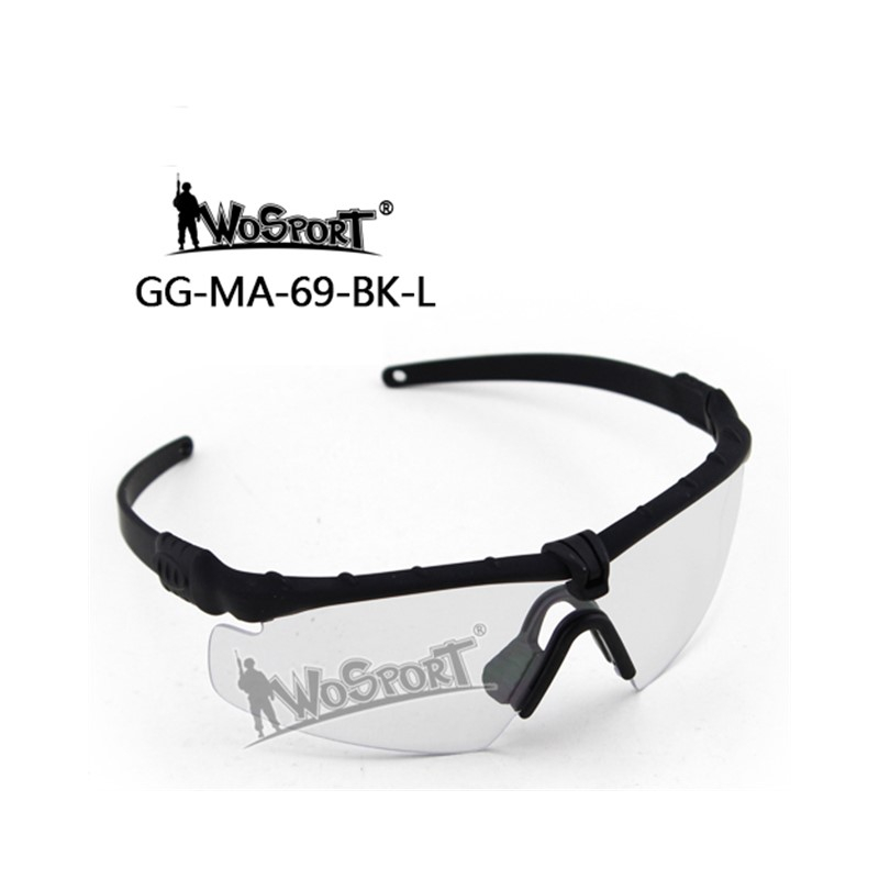 WoSporT MA-69 protective shooting glasses with a clear visor and black frame provide reliable eye protection for airsoft and shooting range use. The lightweight design, UV protection and durable polycarbonate lens ensure comfort and safety throughout the entire game. They comply with the ANSI Z80.3 standard with lens resistance exceeding 3 J (170 m/s).