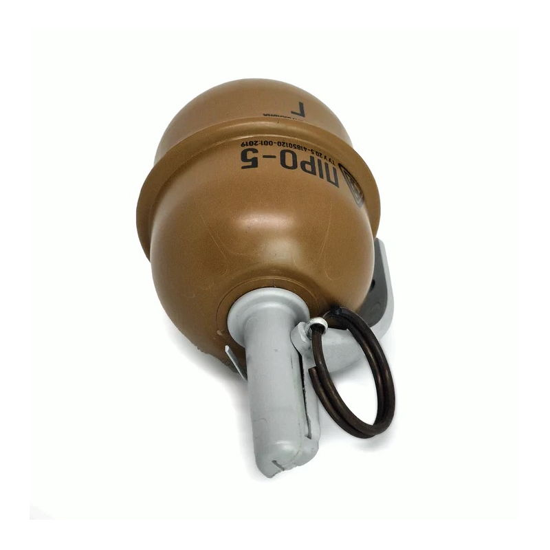 Pyro-5G airsoft hand grenade from PYROSOFT in brown. Realistic replica of the RGD-5 with G-type filling – peas and wax. P1 pyrotechnic category (EN 16263-3), sale 18+ with in-store pickup only. Realistic lever safety for authentic handling training. IP66 waterproofing, resistant to rain and short immersion.