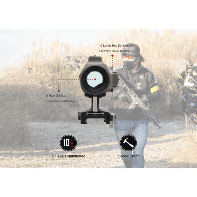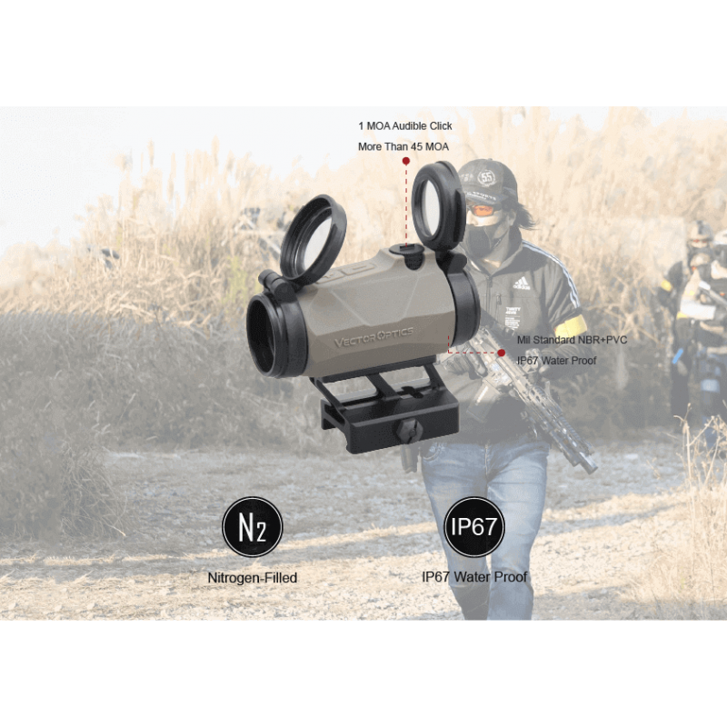 Looking for a high-quality tube-style red dot sight with both high and low RIS mounts? Need a durable optic with a bright, clearly visible dot? Want one of the most reliable red dots for airsoft rifles? The MAVERICK series from Vector Optics delivers exactly that. The MAVERICK-IV 1x20 is a compact, rugged red dot ideal for both range use and airsoft. Its 3 MOA red dot covers roughly the height of a lighter at 100 yards (91.4 m), making it perfect for fast and accurate target acquisition. The sight offers 10 brightness levels to handle everything from bright daylight to low-light environments. The rubber-coated body provides a secure grip and enhances impact and scratch resistance. It also includes a killflash (honeycomb cover) to reduce glare and protect the front lens — in airsoft, it also serves as one-shot protection against incoming BBs. The 41 mm mount height delivers a lower-1/3 co-witness with standard iron sights. According to the manufacturer, the optic is even rated to handle .308 (7.62) recoil. The side battery compartment allows convenient replacement without re-zeroing. The new Maverick Gen4 design features digital brightness controls and a more powerful LED.