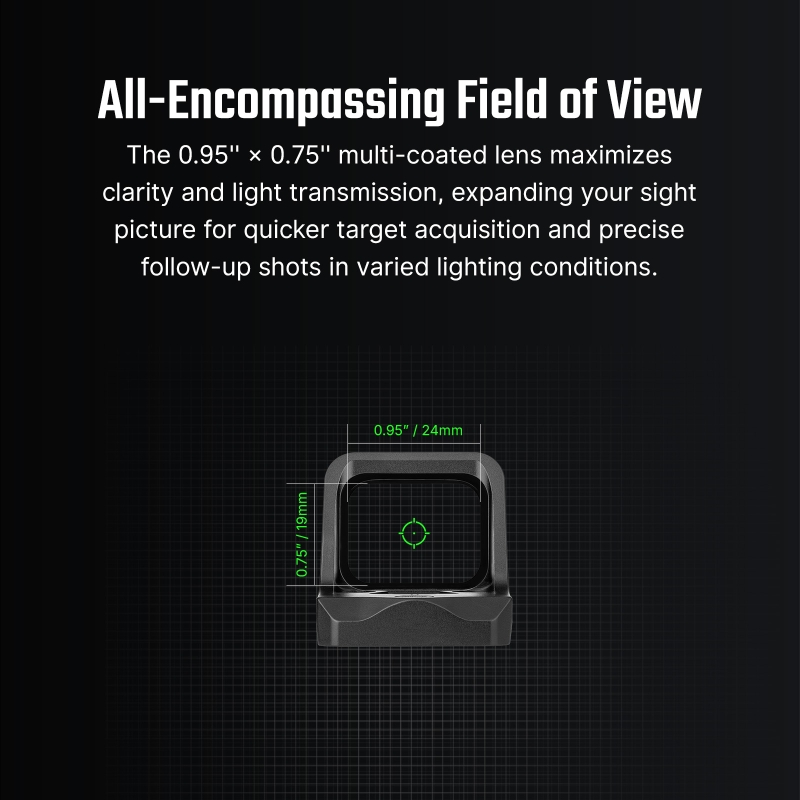 Are you looking for a compact red dot sight with an RMR mount (footprint) that delivers fast target acquisition and precise aiming? Do you need a red dot sight with easy battery replacement directly in the field? Want a green illuminated reticle for CQB and precision shooting? Then OSIGHT C GREEN is the right choice. It combines simplicity with top-tier build quality, highlighted by a large 24 × 19 mm window offering a wide field of view for rapid target acquisition. The bright, crisp reticle (green 3 MOA dot, 32 MOA circle, or both) delivers speed and precision depending on the situation. Side-mounted CR1632 battery replacement allows quick changes without re-zeroing. The 7075-T6 aircraft-grade aluminum body with Type III hard anodizing provides excellent impact and wear resistance. IPX6 protection and a motion-activated sensor (3 min auto-off) save battery life and ensure the sight is always ready. The lenses feature fully multi-coated (FMC) optics for higher light transmission and better contrast in low light. Thanks to the standard RMR footprint, OSIGHT C can be mounted directly onto compatible pistol slides.
