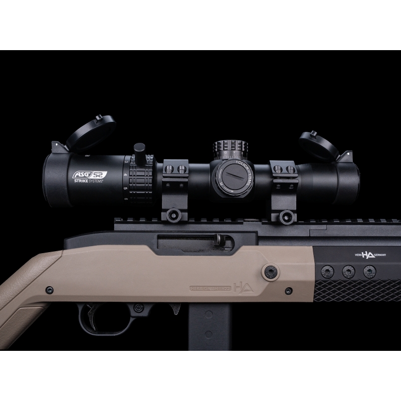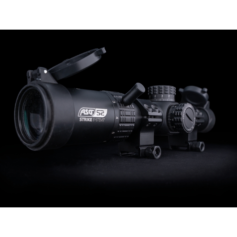 Are you looking for a versatile LPVO rifle scope that offers fast target acquisition like a red dot sight while still delivering a clean image at 6× magnification? Do you want a lightweight and compact LPVO optic with reliable zero retention and intuitive controls? Then the LMTS-02 is the right choice. This optic combines a balanced 28 mm objective lens with a full 1–6× magnification range, making it effective from close-quarters transitions similar to a red dot sight to precise aiming at medium distances. The magnification throw lever allows instant zoom changes even when wearing gloves. Supplied flip-up lens caps protect the lenses, while the robust RIS mounting rings are ready for direct installation on your rifle. Precision adjustment is handled by lockable turrets with fine click values. The minimalist ASG wire reticle provides a clean, uncluttered sight picture and features a central aiming dot and four short reference marks for fast ballistic corrections.