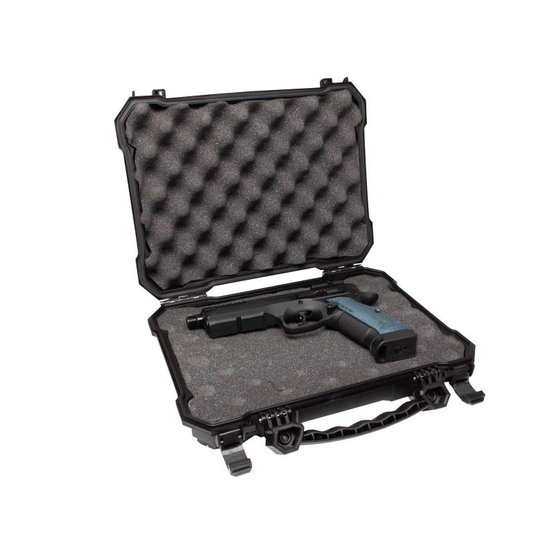The rugged plastic construction protects the contents from impacts and scratches. The Pick and Pluck cube foam insert allows easy shaping of the interior space exactly for your pistol, magazines or accessories. Protection against water and dust is ensured by the IPX7 waterproof rating and a high-quality EPDM seal around the lid. The case features 2 sturdy latches and 2 holes for padlocks for increased security during transport. Thanks to its compact dimensions, it is ideal for pistols such as Glock, Hi-Capa, M1911, Beretta, CZ75, P-09, P-10C and other models up to 290 mm in length.