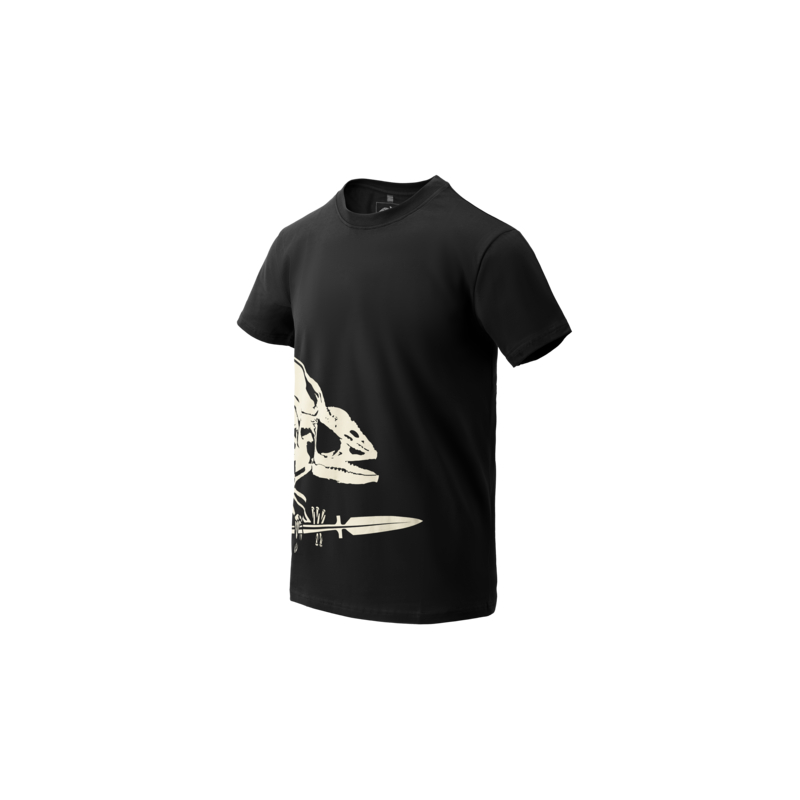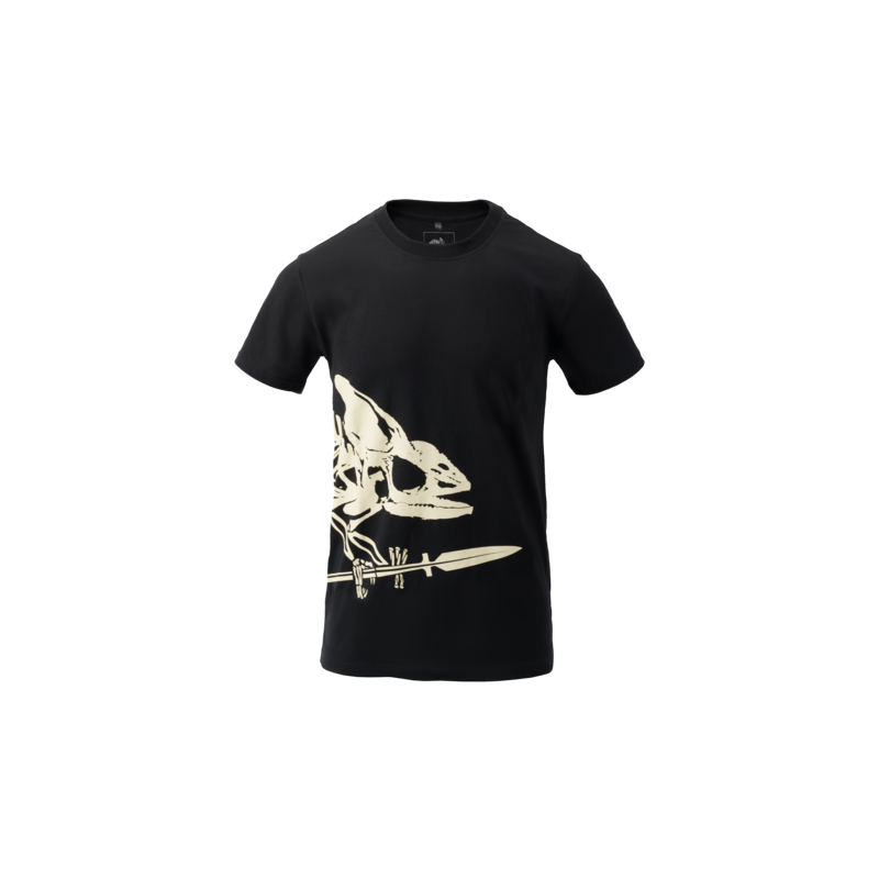 This classic cotton T-shirt comes in a standard fit and features a Full Body Skeleton print showing a chameleon skeleton with a spear along the side, representing the logo of Helikon-Tex. The iconic T-shirt design evolved in the early 20th century from former undergarments (known as the union suit). After World War II, cotton T-shirts in a T-shape became very popular, largely thanks to actors Marlon Brando and James Dean, who wore them in their films.