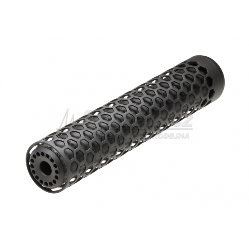 The HIVE T10 by Action Army is a replica of a futuristic sound suppressor designed for airsoft rifles with a 14mm counter-clockwise (CCW) thread. Thanks to its massive dimensions, it’s a great match for long sniper rifles like the AAC T10, SSG10, Silverback SRS and more. The suppressor is made of high-quality anodized T6-6061 aluminum, offering strength while keeping the weight low. The matte finish helps prevent scratches and adds a sleek appearance. The outer shell features a honeycomb pattern simulating a heat shield typically used for thermal dissipation. Inside is a metal tube replicating a baffle chamber. However, the suppressor itself has no sound-reducing effect, making it ideal as a visual upgrade, for covering extended inner barrels or for enhancing the overall aesthetics of the rifle.