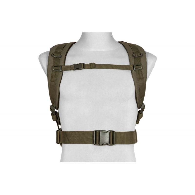 The load-bearing system consists of adjustable suspenders with a chest and waist belts.