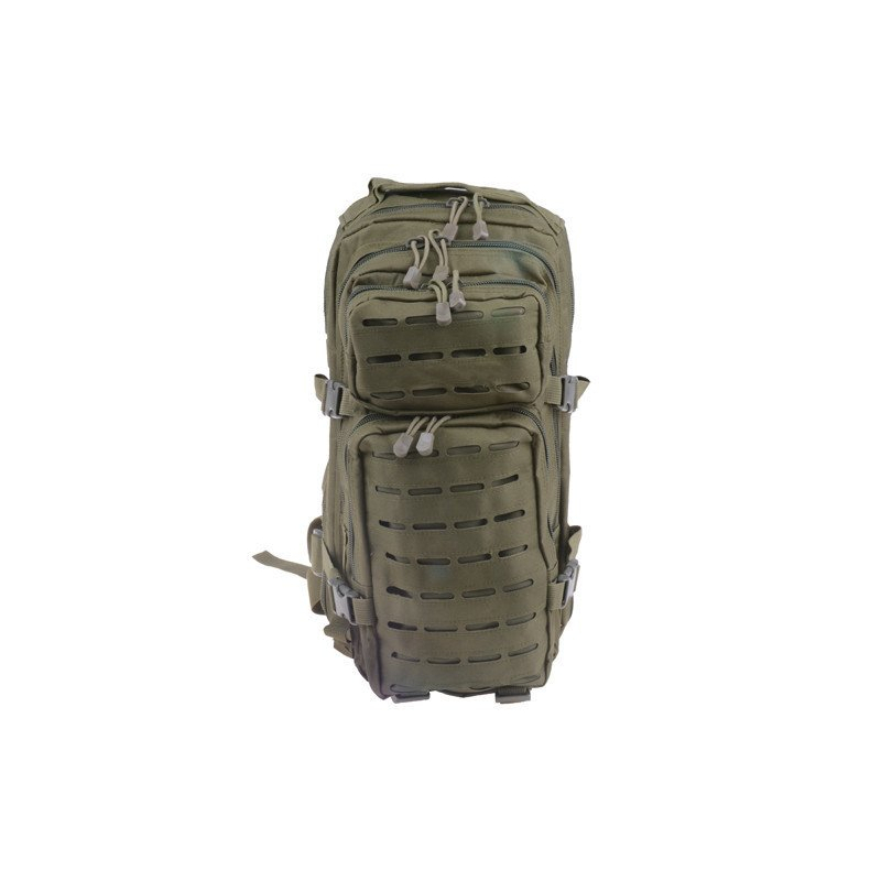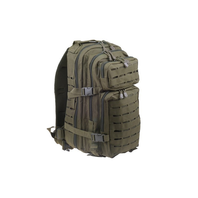 What is the laser cut technology? Instead of traditional MOLLE belts sewed onto the exterior of the backpack, dedicated holes have been cut out using a laser, so that MOLLE belts of pouches can be looped through those holes. The back and straps have been sewn with a distance mesh, which increases load-bearing comfort. The straps are regulated and the entire load-bearing system is complemented with a detachable waist belt. Belts on the sides and the bottom of the backpack fulfil the role of compression belts but also can serve as mounts for additional equipment.