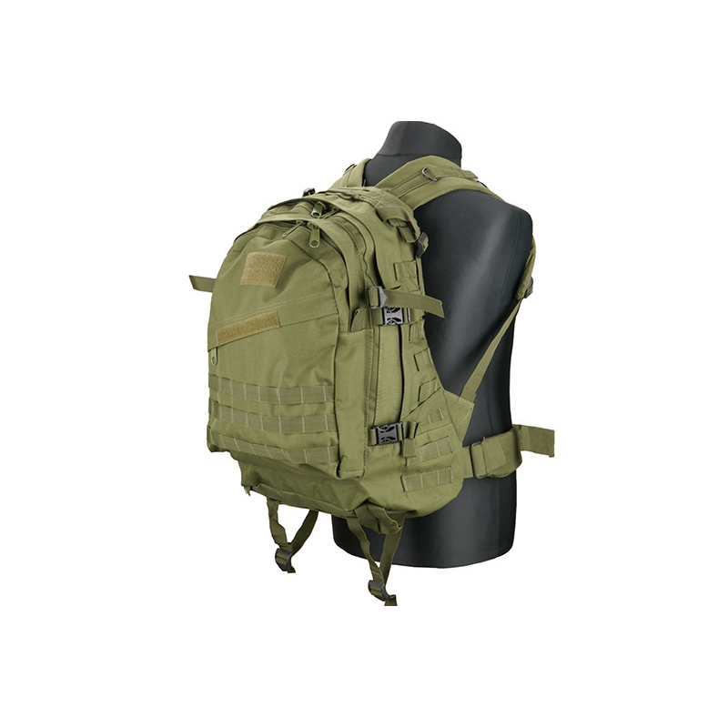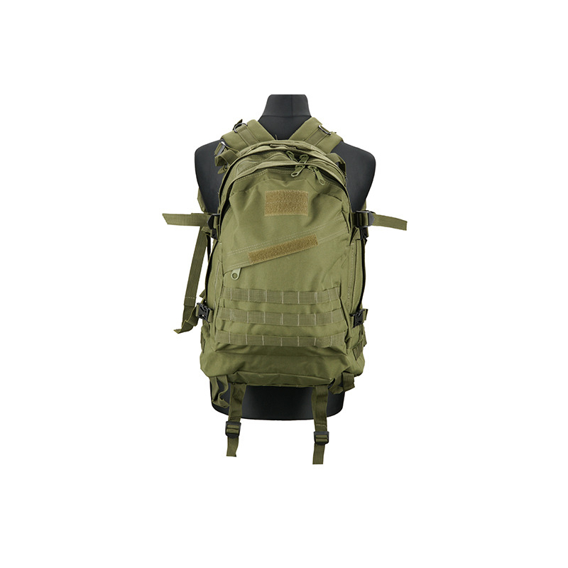 Practical backpack for equipment made of 600D Nylon. It is a classic stitched binding Molle around the perimeter. When motion may insure his position detachable chest strap and an adjustable waist belt. Internal back pocket is intended for hydration pouch and tubing then passes through the hole in the top of the pack. The side straps with Fastex buckle allow attachment of other accessories. The shoulder straps are padded and adjustable. Backpack is ideal for outdoor activities and airsoft.