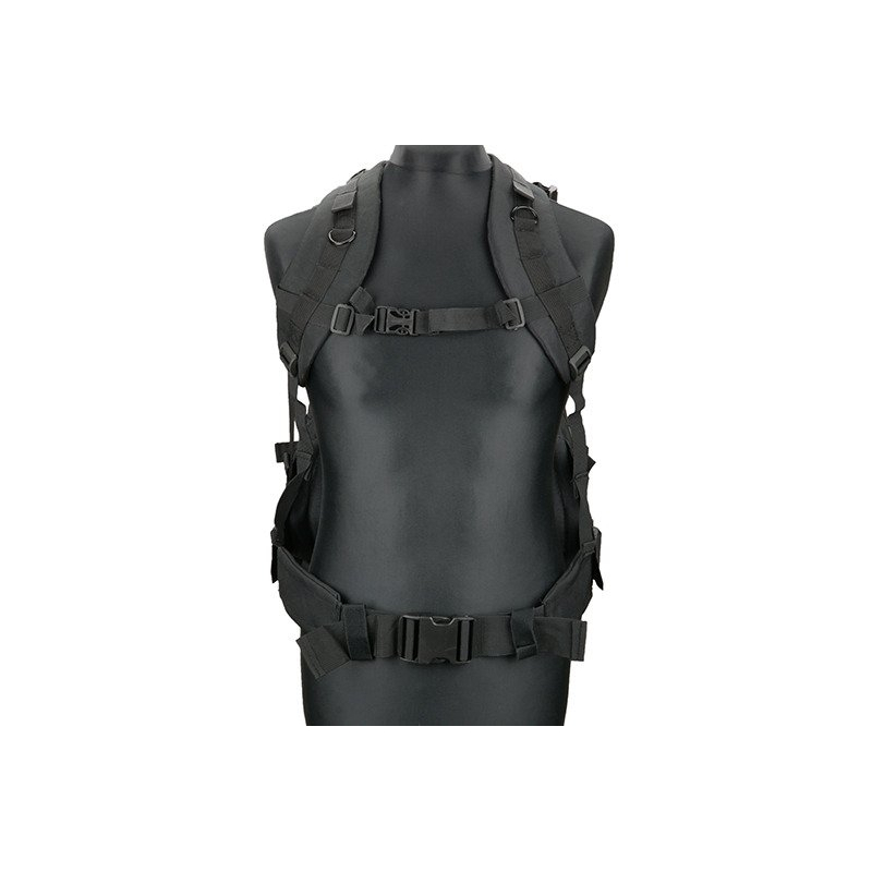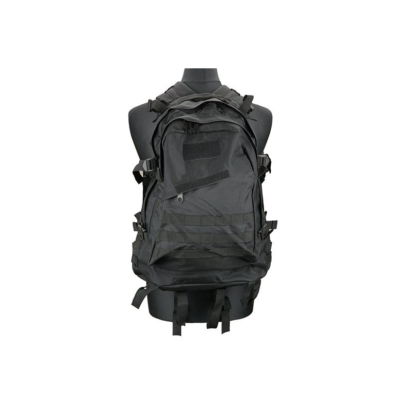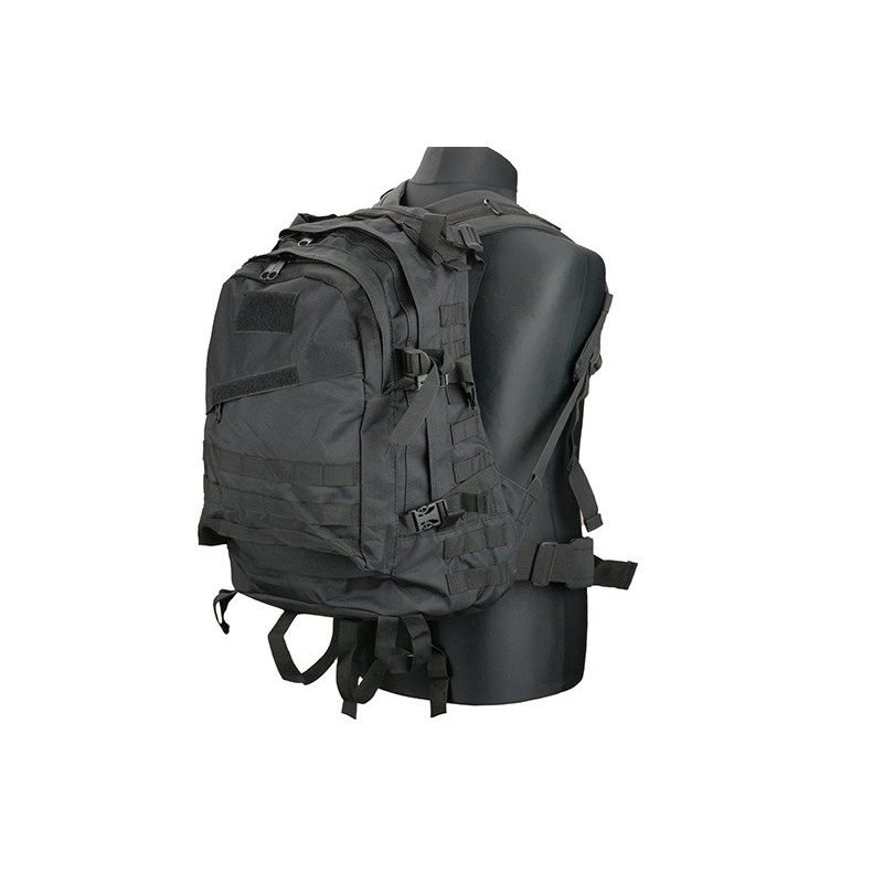 Practical backpack for equipment made of 600D Nylon. It is a classic stitched binding Molle around the perimeter. When motion may insure his position detachable chest strap and an adjustable waist belt. Internal back pocket is intended for hydration pouch and tubing then passes through the hole in the top of the pack. The side straps with Fastex buckle allow attachment of other accessories. The shoulder straps are padded and adjustable. Backpack is ideal for outdoor activities and airsoft.