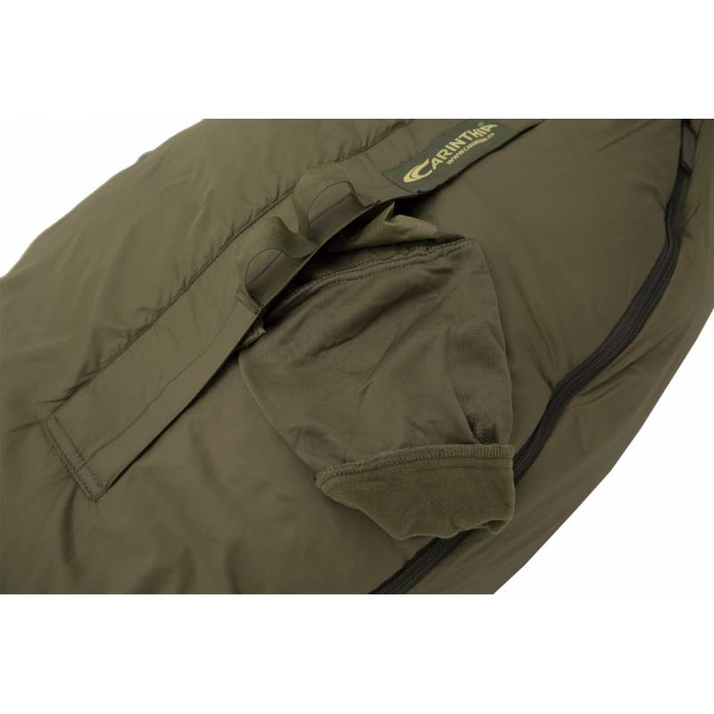 Need a sleeping bag that protects even below -30 °C? Looking for a versatile sleeping system for both sleeping and active use outdoors? The CARINTHIA® WILDERNESS is designed precisely for such situations. Thanks to its unique construction with sleeves and an openable bottom, it can easily be converted into a warm coat – perfect for standing guard, hunting, or operating gear without leaving your sleeping bag. The shoulder and torso area offer plenty of room for comfort even in heavy clothing. At the top are two discreet arm openings with built-in, uninsulated sleeves, while the bottom can be unzipped and tied up for movement. The double-zip system allows users to adjust the interior volume – for maximum warmth by creating an insulating chamber, or for greater comfort during rest. Its 3-layer sandwich construction with thermal-reflective G-LOFT® insulation provides reliable warmth even in extreme cold down to -37 °C. The outer ripstop nylon ensures high durability, while the inner polyester-cotton blend offers soft comfort against the skin. Thanks to its versatility, advanced insulation, and thoughtful design, the WILDERNESS stands among the most advanced sleeping bags ever made by CARINTHIA® — perfect for soldiers, hunters, and expedition members in harsh environments.