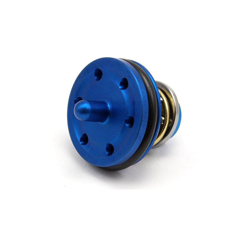 CNC Aluminum Piston Head with Double Sealing by Action Army in blue. Lightweight and durable piston head for maximum performance and airtightness. Integrated ball bearing ensures smooth operation and reduces spring friction. 6 vent holes enhance O-ring compression for airtight efficiency.