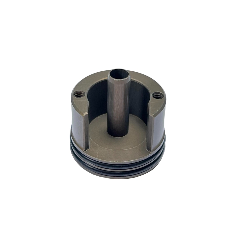 The cylinder head fixation using screws in its part prevents any unwanted movement of the head in the gearbox during firing. The innovative design allows for a longer nozzle guide travel to achieve maximum sealing of the nozzle around the hop-up rubber collar.