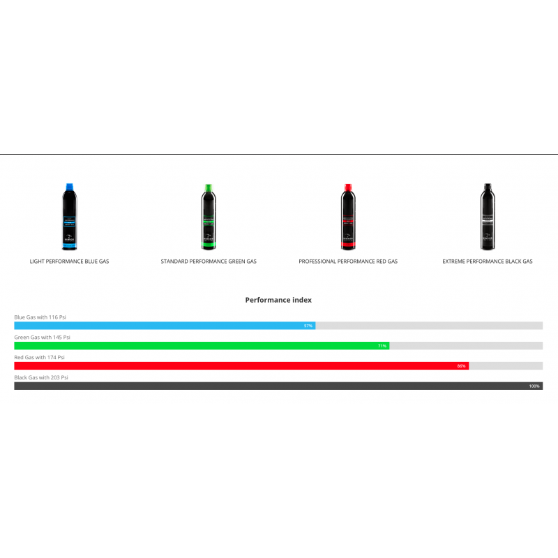 Extremely powerful performance gas. Suitable for winter use and with high end metal pistols and rifles. Improper usage may result in damage to pistols, rifles, grenades and magazines. Features a very stable gas pressure, exceptional trajectory control, low temperature efficiency and increases the performance of your gun significantly.