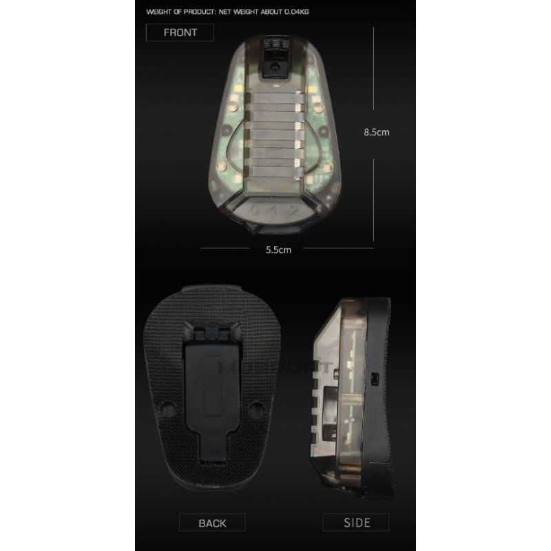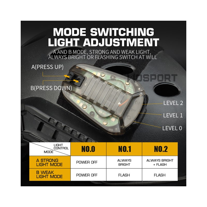 Features: Made of main nylon material, stable fading, long use time Distinguish between red & green lights, quickly identify the enemy, facilitate tactical activities Set battery waterproof ring, prevent battery corrosion effective waterproof A & B mode, strong and weak light, always bright or flashing switch at will Velcro at the bottom, fits tightly to the helmet, easy to use