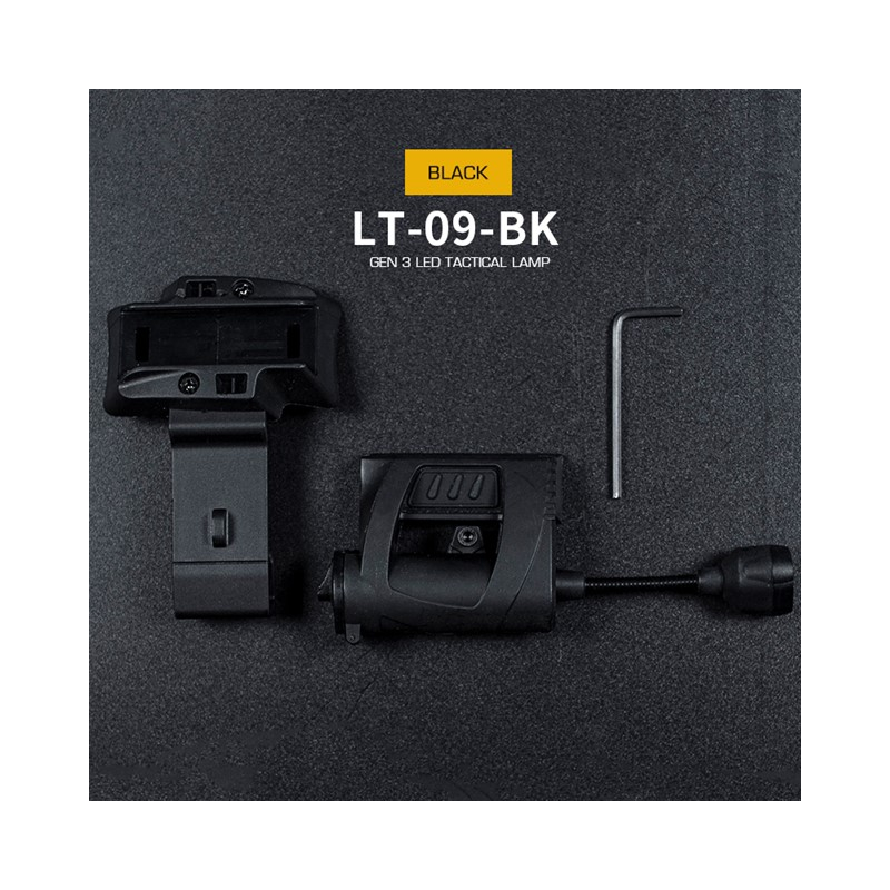 The material of the body is durable and the flashlight is controlled by a large button that cannot be missed. You can switch the light white, green, red or IR.