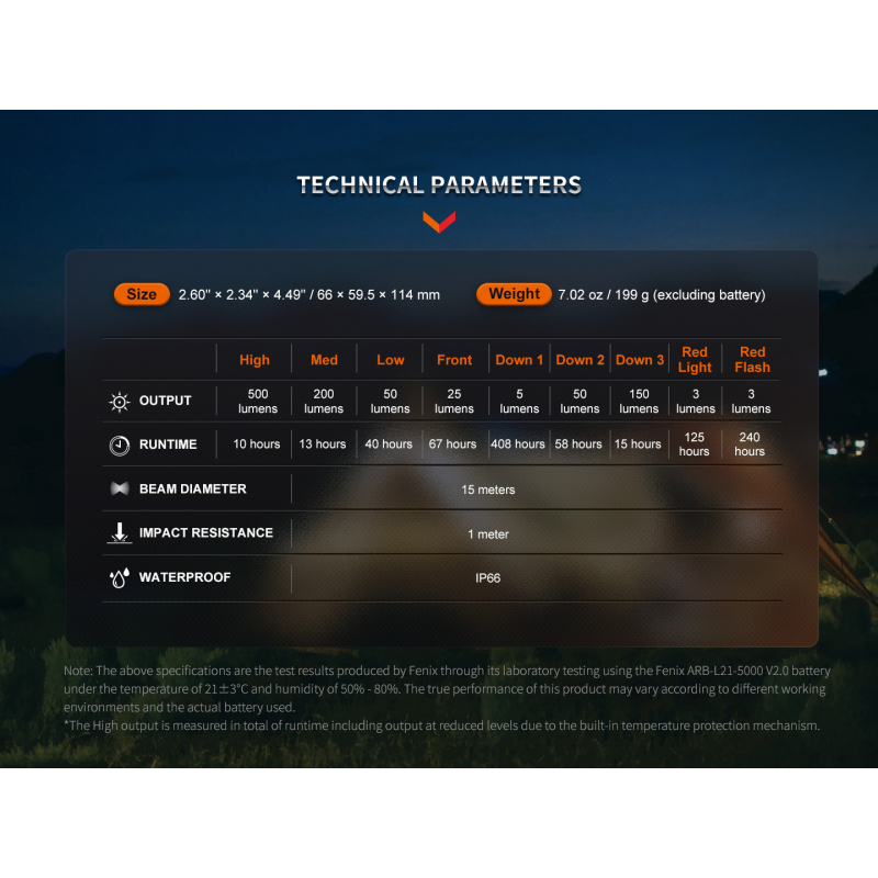 - Powered by a single Fenix ARB-L21-5000 V2.0 battery. The Fenix ARB-L18 series battery can also be used in combination with the ALF-18 battery holder.