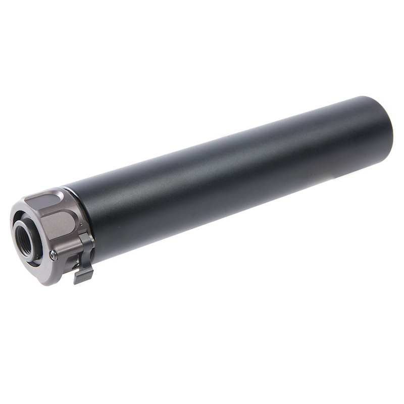 The suppressor body is crafted from durable 6061 aluminum with realistic deep engraving and finishing, while small locking mechanism parts are made of steel for added durability. The package also includes the SOCOM 4 flash hider with a QPQ finish. The flash hider installs onto the weapon using a 14mm CCW thread. The suppressor attaches directly to it via the quick-detach system (QD). Simply align the suppressor with the guiding grooves and twist the base of the suppressor. This suppressor combines a realistic design with high functionality.