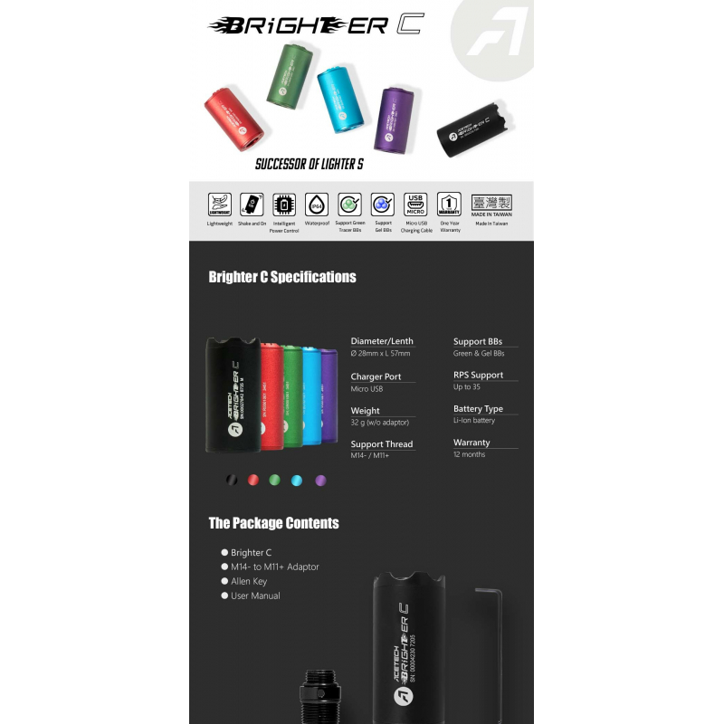 Do you want your airsoft gun to fire laser-like shots like in Star Wars so you can easily track your hits in low light or CQB arenas? Looking for a universal tracer suppressor that works for pistols and can also be used as an insert inside a larger suppressor? Then the AceTech BRIGHTER C is exactly what you need. This mini suppressor is designed for tracer BB illumination and is dust- and splash-resistant (IP64), making it ideal for outdoor games. The main innovation is its completely buttonless design – simply shake it and you’ll hear a beep. The built-in Li-Ion battery provides illumination for up to 20,000 BBs, and after 5 minutes of inactivity, the device automatically powers off. Charging is handled by a USB-C port, with a full charge in just 2.5 hours. The suppressor features a 14 mm CCW thread, and comes with an 11 mm CW adapter for pistols.