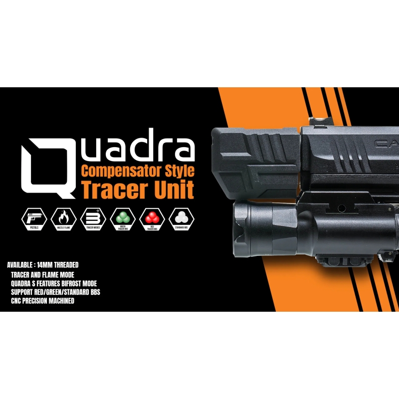 AceTech QUADRA Tracer Unit compensator for airsoft pistols combines tracer BB illumination and realistic muzzle flash simulation. The compact compensator-style body fits pistols perfectly and does not interfere with holster use. With 3 modes, motion activation and USB-C charging, it is an ideal upgrade for any pistol platform.