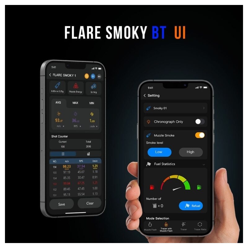 Flare Smoky BT combines a tracer unit, smoke generator, muzzle flash simulation and velocity chronograph in one compact device. This gives you a realistic shooting effect along with precise control of your gun’s performance. The unit handles rates of fire up to 50 BB/s, making it suitable even for high-performance high RoF builds and DSG setups. Two smoke intensity levels let you adjust the effect from light haze to dense smoke. Bluetooth connectivity allows easy control via the ESHOOTER mobile app (Android / iOS), where you can manage all modes and monitor the fluid level indicator. Thanks to the integrated battery, it delivers up to 15,000 shots, while the CNC-machined body with operational safety certification ensures durability without leakage or corrosion.