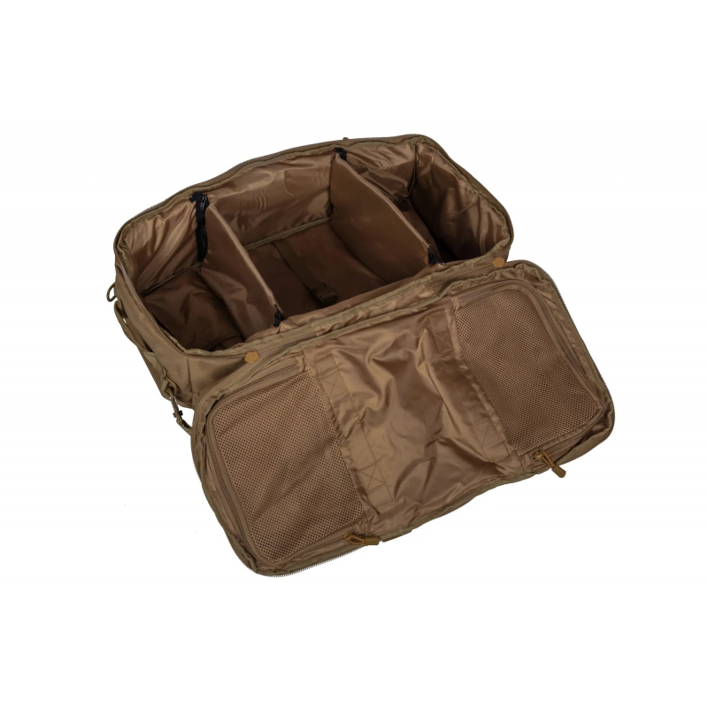 The interior space is divided into 3 sections by two partitions that can be folded using zippers. Under the lid, you'll find two large pockets with a mesh for small items and documents. On the exterior, there are two long side pockets with zippers, perfect for storing accessories such as GBB bottles, fillers, and BBs.