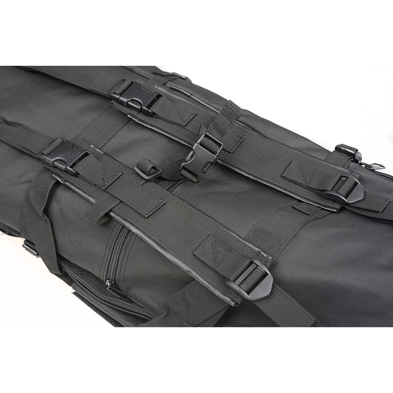 The gun bag is made of nylon. Thanks to the application of the additional sleeve the cover will without any problem hold a gun that is up to 1300mm long. Inside of the main chamber there are two additional gun mounting bands. Inside the front 620x260mm big pocket we will fit a machinegun. The gun mounting bands are also located in it.