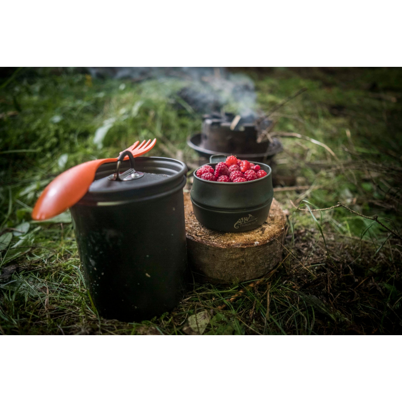 The CAMP mug from Helikon-Tex is made of anodized aluminum, providing strength and durability even in demanding conditions. With a capacity of 0.85 liters, it is ideal for preparing drinks or meals in the wild. The mug is suitable for use on a gas stove or open fire, making it a versatile tool for outdoor enthusiasts. The lid helps maintain the temperature of the contents, and the foldable insulated handles ensure safe handling without the risk of burns. Thanks to its size and internal diameter, it can accommodate a 1-liter PET bottle for easier transport. The mug comes with a mesh bag for easy storage and transport.