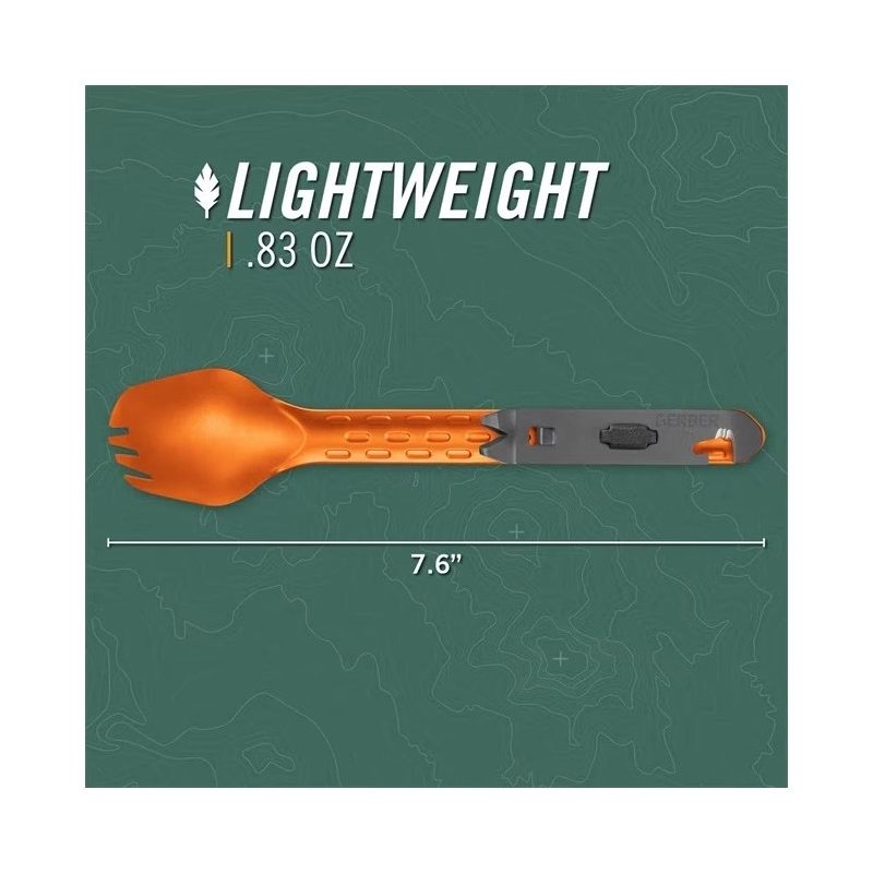 Looking for compact cutlery that can do more than just eat? Want a lightweight yet functional cutlery set for travel, camping, or airsoft that takes up almost no space while offering maximum utility? GERBER ComplEAT Multi Fork is a smart multifunctional cutlery tool that combines a fork, spoon, and a practical multitool with a total of 9 functions. Thanks to its modular design, the cutlery can be separated into 2 parts (the cutlery itself and the rear tool holder), with each part usable independently. The durable body made from 7075 T6 aircraft-grade aluminum ensures long service life, low weight, and corrosion resistance thanks to anodizing. The textured surface improves grip even when wearing gloves or with wet hands.