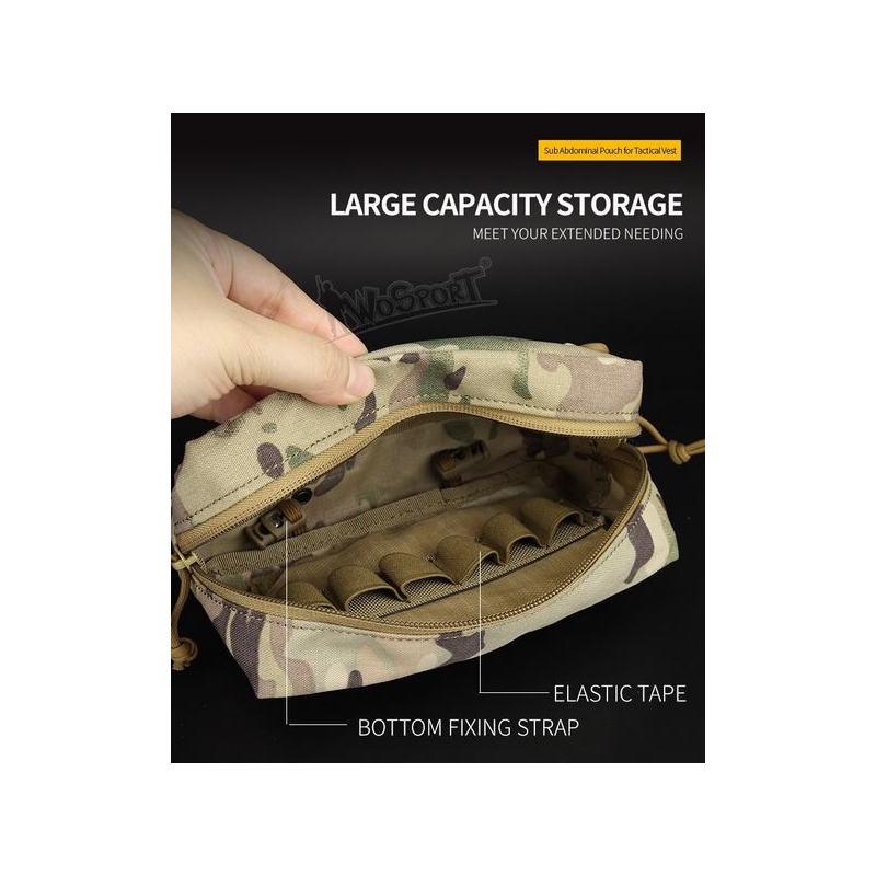 Brušná sumka (Fanny Pack) od firmy WoSport je taká univerzálna kapsa na všetko potrebné, čo chcete mať po ruke. Chytré umiestnenie sumky na bruchu pod nosičom plátov (alebo chest-rigom) zaručuje, že môžete mať dôležité vybavenie ľahko dostupné, ale zároveň nemusíte obmedziť počet zásobníkových sumiek, pretože sumka vďaka upínaniu na suchý zips neobsadzuje miesto na MOLLE väzbe. Nájdete na nej veľkú hlavnú kapsu s dvojcestným zipsom s veľkými ťahadlami pre ľahké otváranie aj s rukavicami. Vo vnútri hlavnej kapsy je gumená pruženka prešitá tak, aby do nej bolo možné pevne uchytiť vybavenie ako multitool, svietidlo, plničku alebo patróny do brokovnice. Vpredu na sumke je menšia plochá kapsa na dokumenty uzatvárateľná zipsom. Sumka je vyrobená z vysoko odolného materiálu Nylon 1000D, ktorý zabezpečuje dlhú životnosť a odolnosť voči pretrhnutiu. Navyše je k dispozícii v niekoľkých farebných variantoch, takže si ju zladiť podľa vašej výstroje.