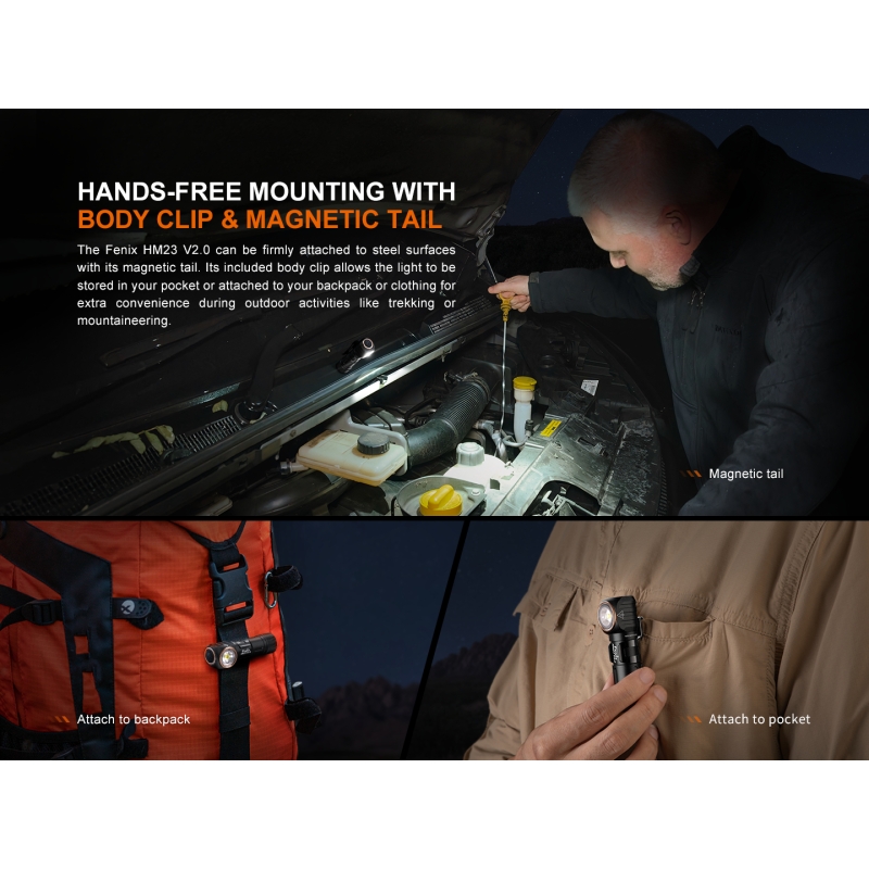 Hľadáte ľahký, odolný a spoľahlivý zdroj svetla na šport, prácu alebo turistiku? Chcete jednoduché napájanie bežnou alkalickou AA batériou a zároveň vysokú odolnosť voči vode aj nárazom? Potrebujete multifunkčnú čelovku, ktorú možno používať aj ako vreckovú baterku? Potom je Fenix HM23 V2.0 ideálnou voľbou. Táto kompaktná čelovka ponúka až 300 lumenov bieleho svetla, doplneného o červené LED na nenápadné svietenie alebo núdzovú signalizáciu. Celokovové telo z leteckého hliníka zabezpečuje výborné chladenie, dlhú životnosť a vodotesnosť IP68 až do hĺbky 2 metrov. Vďaka vyberateľnému svetlu, magnetickej koncovke a oceľovej spone možno HM23 V2.0 jednoducho pripnúť na vrecko, popruh alebo kovový povrch. Nízka hmotnosť a dlhá výdrž ju predurčujú na beh, turistiku, kempovanie, rybolov, prácu aj ako pohotovostné svetlo do auta.