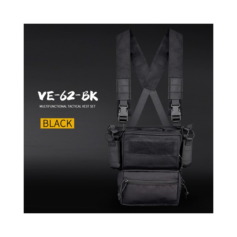 Taktická hrudná súprava na airsoft s nízkym profilom a veľkými vreckami. Z hornej strany môžete vložiť vložku na tri väčšie zásobníky, po stranách sú potom dve menšie vrecká na pištoľové zásobníky, ktoré drží na mieste sťahovacia šnúrka. Hlavné náprsné vrecko na zips je vo vnútri dostatočne priestranné, s dvoma elastickými popruhmi a panelom na suchý zips, ktorý vám pomôže udržať v ňom poriadok.