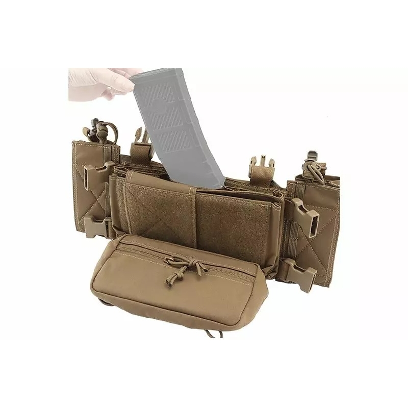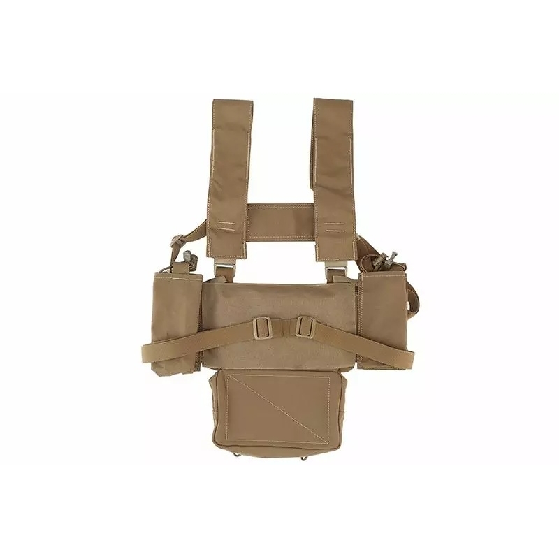 WoSporT taktický Micro Chest Rig MK4 v Coyote prevedení je ľahký modulárny chest rig pre maximálnu variabilitu výstroja. Ponúka inserty na zásobníky M4 / AK a 40mm granáty, bočné kapsy na vysielačku a břišní sumku typu dangler (drop down). Vďaka VELCRO systému a H popruhom si ho jednoducho prispôsobíte podľa misie.