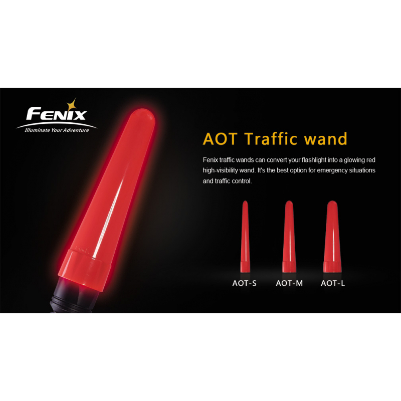 Červený signální kužel Fenix AOT-M pro svítilny Fenix TK09, TK11 TAC TK15 UE, TK16, TK16 V2.0, TK20R a RC10. Rozptyluje původně velmi úzký světelný paprsek reflektoru svítilny do všech stran. Svítilnu s výstražným dopravním kuželem tak lze využít například pro řízení pozemní i letecké dopravy. Jedná se o vhodný doplněk pro policii, hasiče, záchranáře a letištní personál.