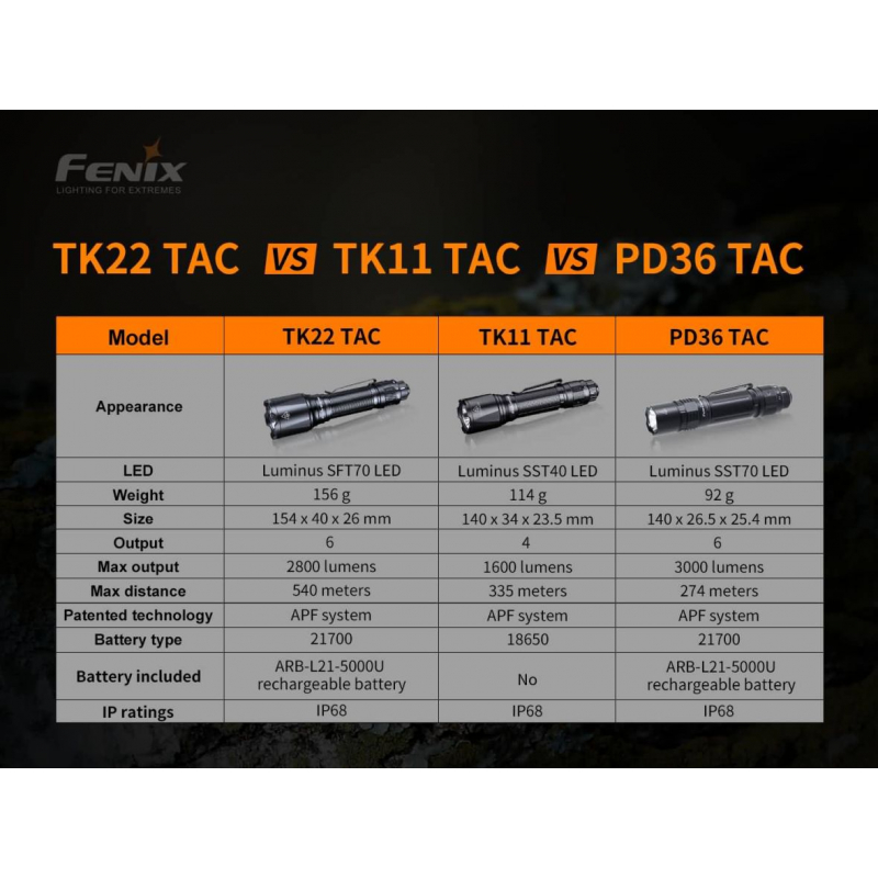Taktická LED baterka Fenix TK22 TAC je mimoriadne výkonná a praktická svietilna, ktorá sa nestratí vo výbave žiadneho príslušníka ozbrojených zložiek, poľovníka, policajta, domáceho majstra či hráča airsoftu.