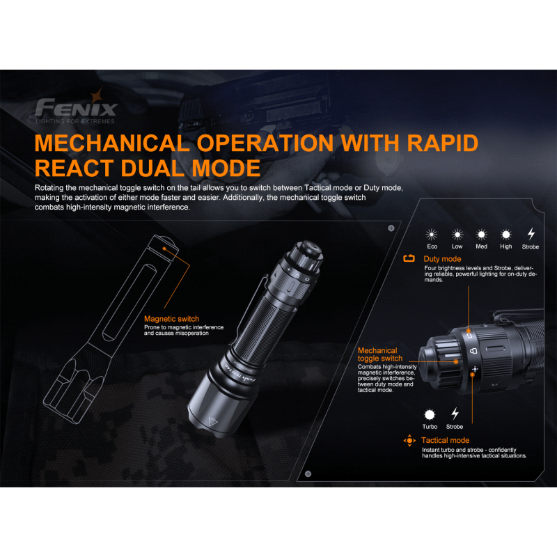 Zadný prepínač umožňuje rýchle prepínanie medzi taktickým režimom, ktorý obmedzuje svetlo len na úrovne jasu Turbo a stroboskop pre špeciálne situácie, alebo režimom Duty, ktorý sprístupňuje všetky ostatné režimy osvetlenia pre všetky ostatné potreby.