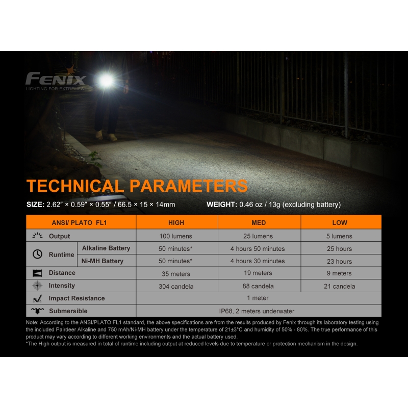 Napájanie zabezpečuje AAA batéria, ktorá poskytuje maximálnu výdrž až 25 hodín pri najnižšom režime svietenia. Baterka má 3 režimy svietenia, ktoré umožňujú prispôsobiť intenzitu svetla podľa aktuálnej potreby. Vďaka vodotesnosti a odolnosti proti nárazom (stupeň krytia IP68) je vhodná aj do náročných podmienok.