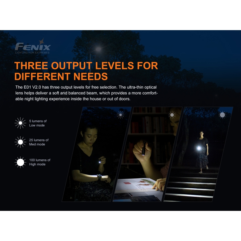 Fenix E01 V2.0 je ľahká, výkonná a spoľahlivá baterka s výkonom 100 lúmenov a dosvitom až 35 metrov. Vďaka kompaktnej konštrukcii sa dá jednoducho prenášať vo vrecku, pripevniť na kľúče alebo vložiť do batohu. Baterka využíva LED diódu s životnosťou až 50 000 hodín, čo zaručuje dlhodobú spoľahlivosť.