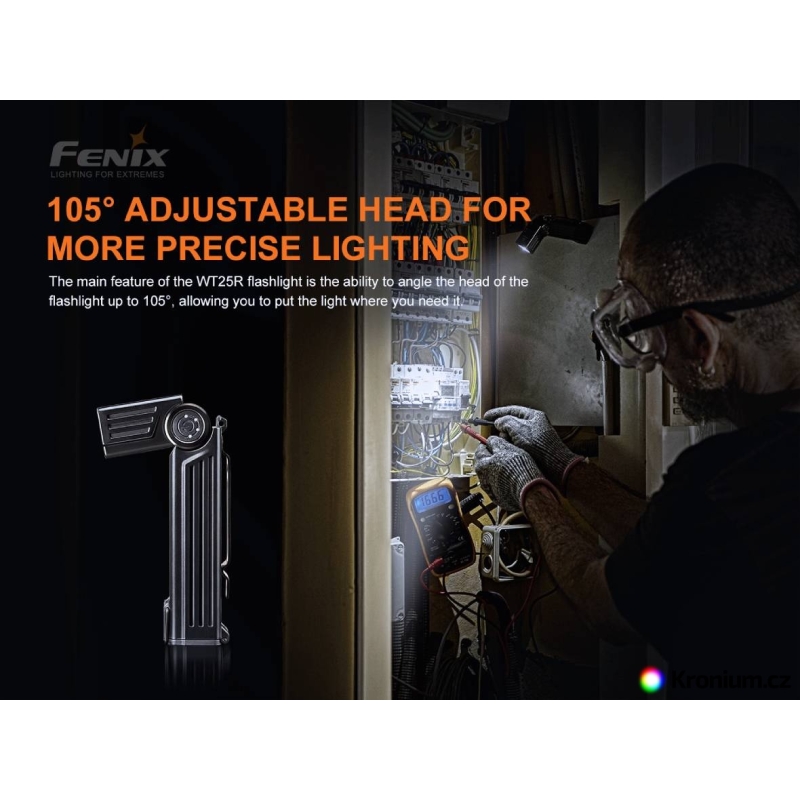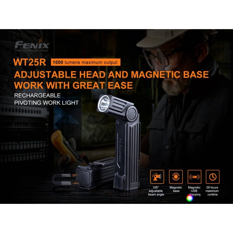 Hľadáte pracovnú svietidlo, ktorá sa prispôsobí každej situácii? Potrebujete svetlo do dielne, na servis, kempovanie alebo pohyb v teréne? Chcete svietidlo, ktoré pripnete na opasok, prichytíte magnetom alebo postavíte na stôl? Potom je Fenix WT25R presne pre vás. Vďaka unikátnej kĺbovej konštrukcii je možné hlavu svietidla naklápať v rozsahu 105°, takže si svetlo vždy nasmerujete tam, kam potrebujete. Výkonná dióda LED Cree XP-L HI poskytuje až 1000 lúmenov s dosvitom 220 m, pričom digitálna regulácia udržiava konštantný jas. Svietidlo je napájané dobíjateľným Li-ion akumulátorom 18650, ktorý sa pohodlne nabíja pomocou magnetického USB kábla priamo v svietidle. Robustná konštrukcia, IP66 vodoodolnosť a nízka hmotnosť robia z WT25R ideálne pracovné svietidlo.