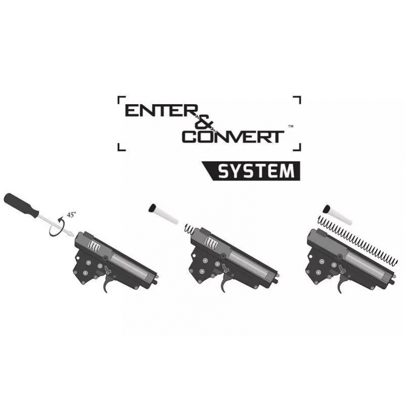 Dnes už bežným štandardom je QSC Enter&Convert™ systém rýchlej výmeny pružiny, ktorý vám umožní inštalovať silnejšiu alebo slabšiu pružinu podľa potreby. Po vybratí mechaboxu z tela je potrebné vybrať vodiacu tyč s pružinou cez rám mechaboxu. Všetko za pár sekúnd.