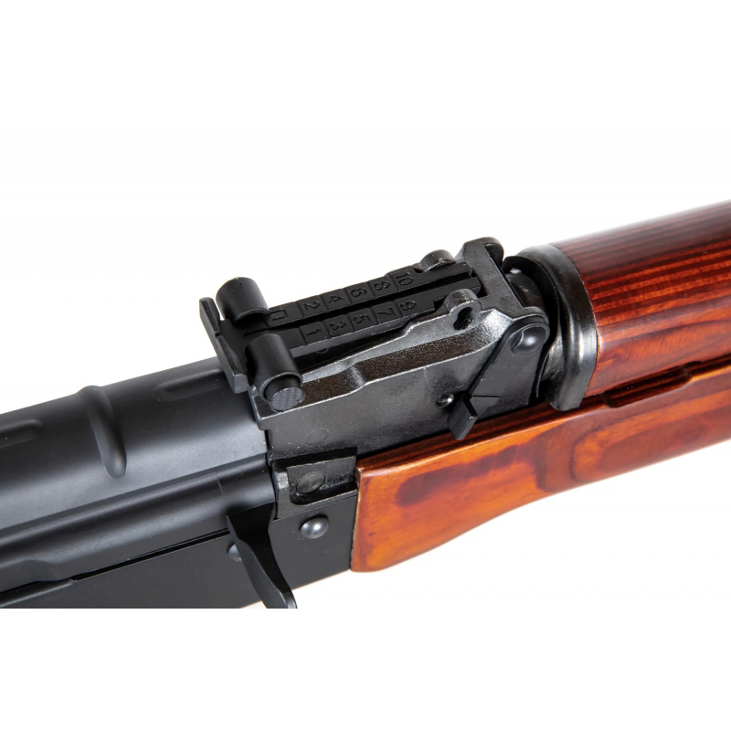 To je AEG puška Specna Arms AK-74 série J-Series Edge™ s pažbením z pravého dreva.