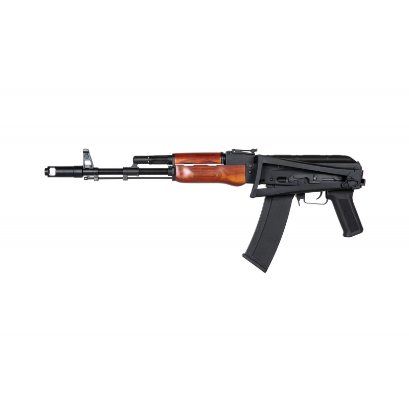 To je AEG puška Specna Arms AK-74S série J-Series Edge™ s predpažbím z pravého dreva a sklopnou pažbou.